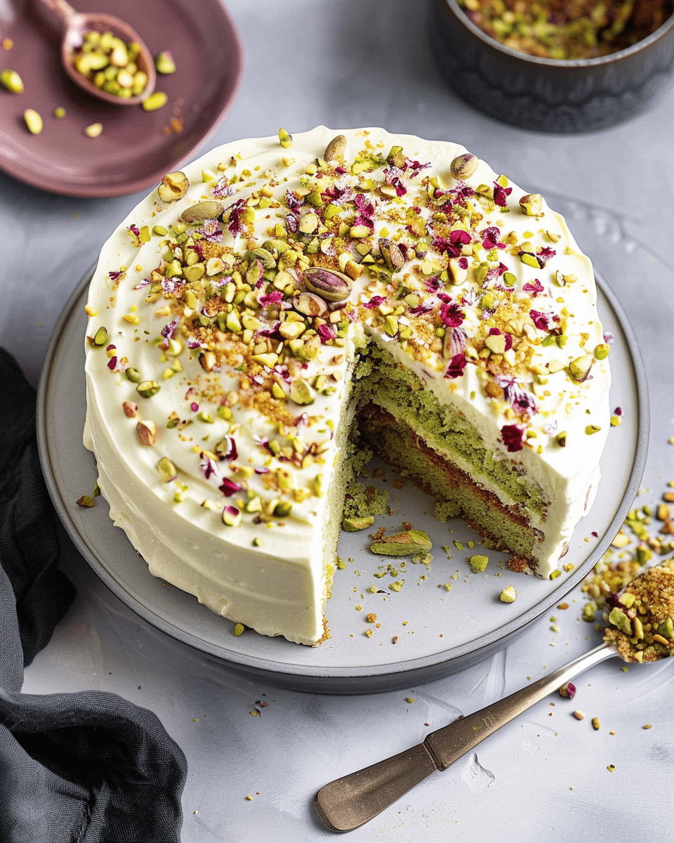 Frosted Pistachio Cake: Top with cream cheese or mascarpone frosting for added richness.