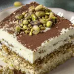 Pistachio tiramisu is a no-bake, elegant dessert that combines creamy mascarpone, rich pistachio paste, coffee-soaked ladyfingers, and crunchy pistachio garnish. A nutty twist on the Italian classic, perfect for impressing guests.