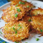 Store leftover latkes in an airtight container in the refrigerator for up to 3 days. To reheat, bake in a 375°F (190°C) oven for 10–12 minutes or re-crisp in a skillet over medium heat. Latkes can also be frozen—layer them with parchment paper in a freezer-safe container. Reheat from frozen in the oven until heated through and crispy.