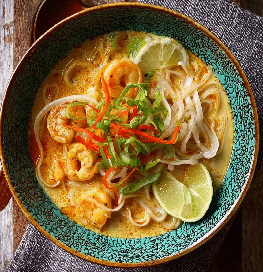 This prawn laksa is a rich, creamy, and aromatic noodle soup made with coconut milk, bold spices, and tender prawns. A quick and easy prawn laksa recipe that delivers authentic flavor, perfect for a comforting and satisfying meal.