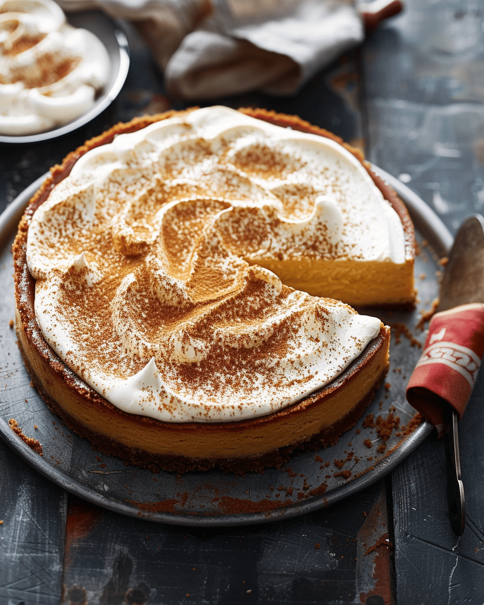 Pumpkin cheesecake is a rich and creamy dessert that blends the flavors of traditional cheesecake with warm fall spices and pumpkin puree, all on a buttery graham cracker crust. Perfect for holidays or cozy gatherings.
