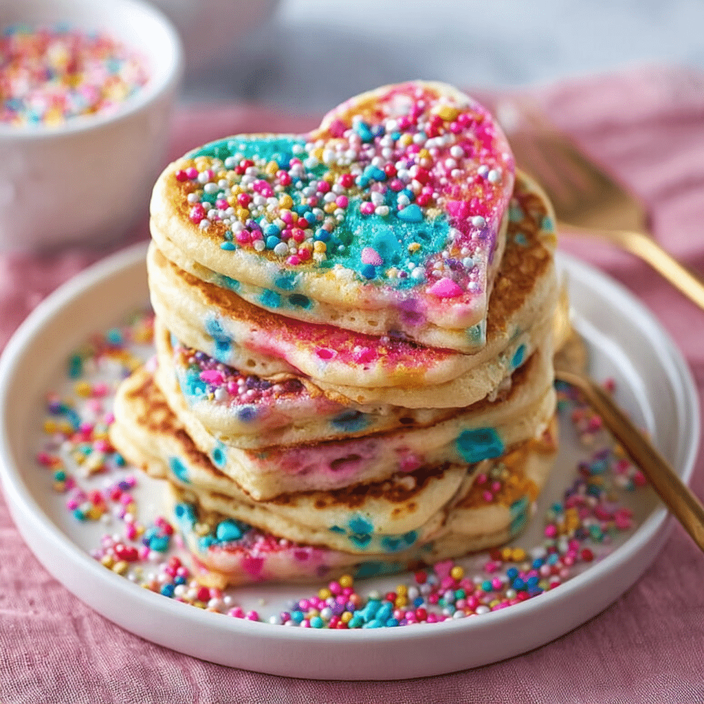 Do not overmix the batter to keep pancakes light and fluffy.Rainbow jimmies work best as they hold their color better during cooking.Use a squeeze bottle or mold for cleaner heart shapes.Keep pancakes warm in a low oven while cooking batches.Great for holidays, birthdays, or fun weekend breakfasts.