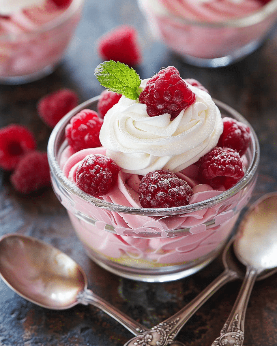 Serve: Once the mousse has set, garnish with fresh raspberries, a dollop of whipped cream, and mint leaves for a beautiful touch. Serve chilled.