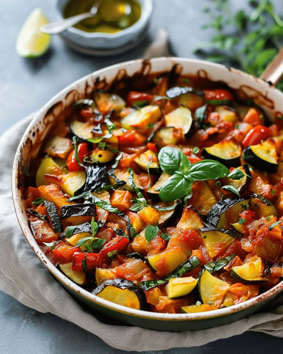 Ratatouille is a traditional French Provençal vegetable stew made with eggplant, zucchini, bell peppers, tomatoes, and herbs. It’s hearty, healthy, and full of Mediterranean flavor—perfect as a main dish or side.