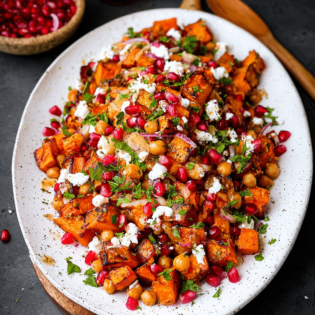 This recipe combines sweet, savory, tangy, and nutty flavors in one satisfying dish. The roasted sweet potatoes turn tender and slightly caramelized, while the chickpeas add a hearty, slightly crisp texture. The creamy feta and fresh pomegranate seeds elevate the dish with contrast and brightness. It’s nutritious, filling, and perfect as a main or a standout side.