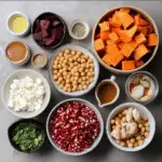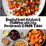 Roasted sweet potatoes and chickpeas with feta, pomegranate, and maple tahini is a beautifully balanced dish that’s as nourishing as it is flavorful. With its mix of textures and bold ingredients, it’s a versatile recipe that works for weeknight dinners, meal prep, or entertaining guests.