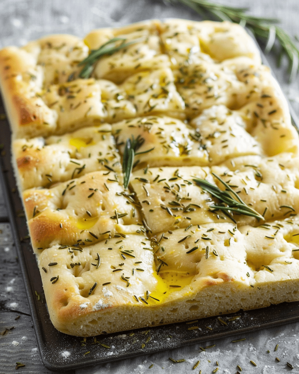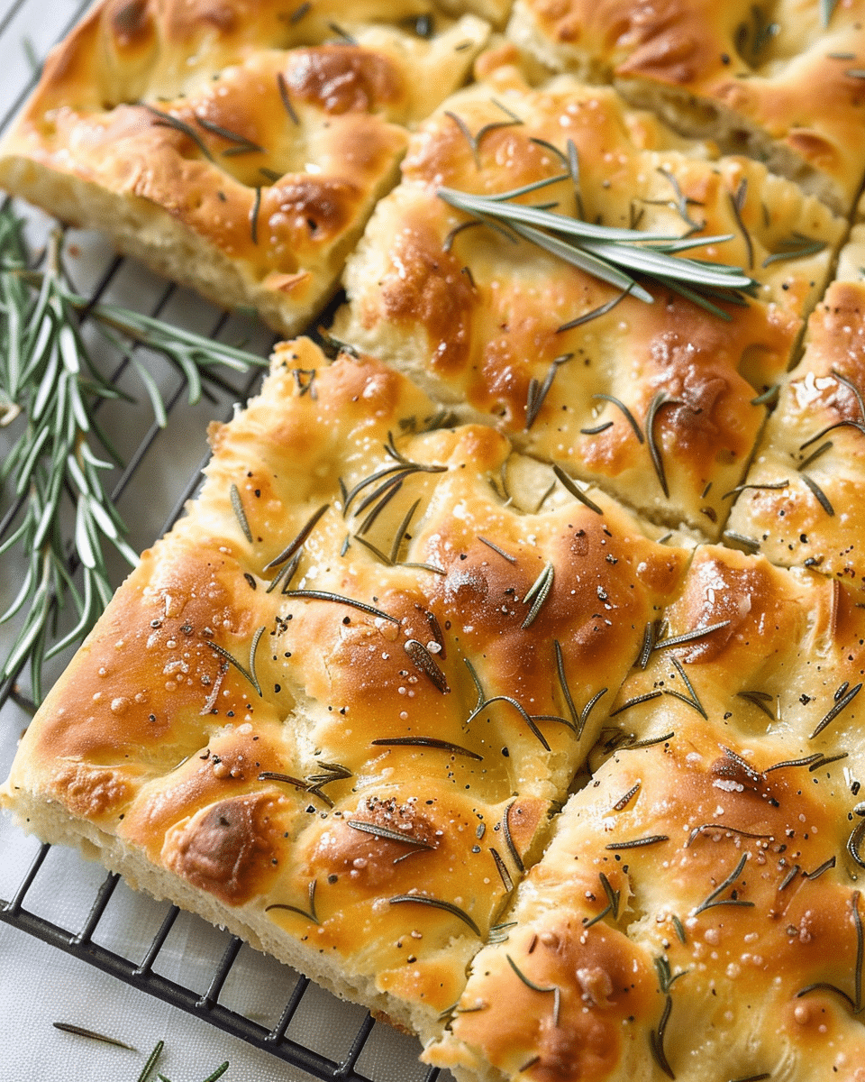 Use fresh rosemary for the best flavor, but dried rosemary can be used in smaller quantities.Top with garlic, olives, cherry tomatoes, or cheese for variations.For a crispier crust, bake in a metal pan and don’t skimp on olive oil.Store at room temperature for 2 days or refrigerate for up to 5 days.Reheat in the oven for best texture; avoid microwaving.
