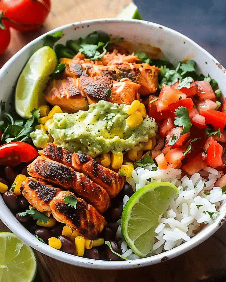 A fresh, vibrant, and healthy Salmon Burrito Bowl featuring tender, seasoned salmon paired with a colorful array of vegetables, grains, and flavorful toppings. A nutritious alternative to a traditional burrito, it’s loaded with omega-3s, fiber, and essential vitamins.