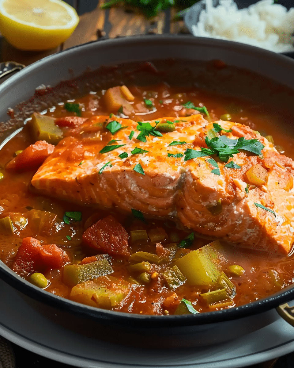Salmon Stew is a comforting, hearty dish that brings together tender chunks of salmon with a rich, flavorful broth and a medley of vegetables. This warm, nourishing stew is perfect for a cozy dinner or a light yet satisfying meal. With a balance of savory, slightly creamy broth and the delicate, flaky texture of the salmon, this stew is sure to become a new favorite in your recipe rotation.