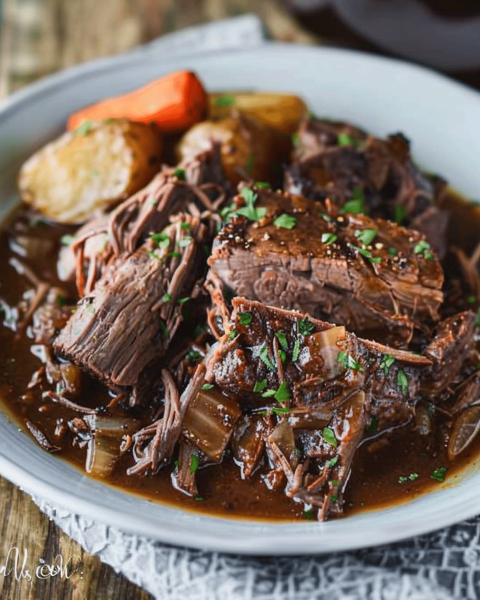 Slow cooker pot roast is a classic comfort food dish made with tender beef, hearty vegetables, and a rich, flavorful gravy. Cooked low and slow, the beef becomes melt-in-your-mouth tender, and the vegetables soak up all the savory flavors. It’s a hearty, satisfying meal perfect for family dinners, Sunday gatherings, or cozy nights in.