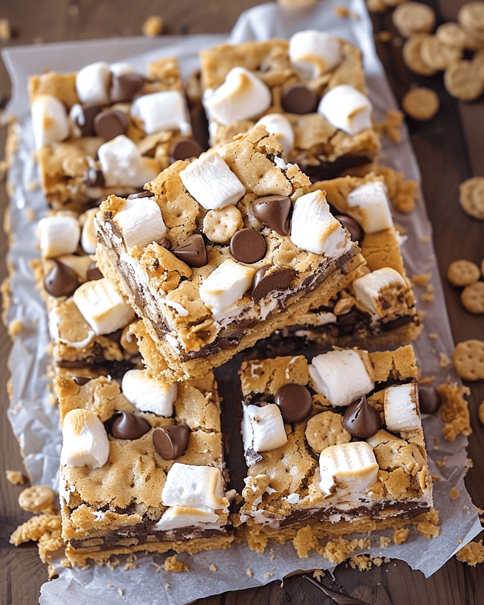 For a vegan version, substitute the butter with plant-based butter and use dairy-free chocolate chips and marshmallows.To add a crunchy twist, sprinkle chopped nuts like pecans or almonds on top of the bars.For extra gooeyness, layer the chocolate chips and marshmallows twice—once in the middle of the dough and again on top.If you don’t have graham crackers, substitute with digestive biscuits, shortbread, or even animal crackers, crushing them into small pieces.To make these bars even more indulgent, drizzle with extra melted chocolate or top with additional marshmallows and graham cracker crumbs after baking.