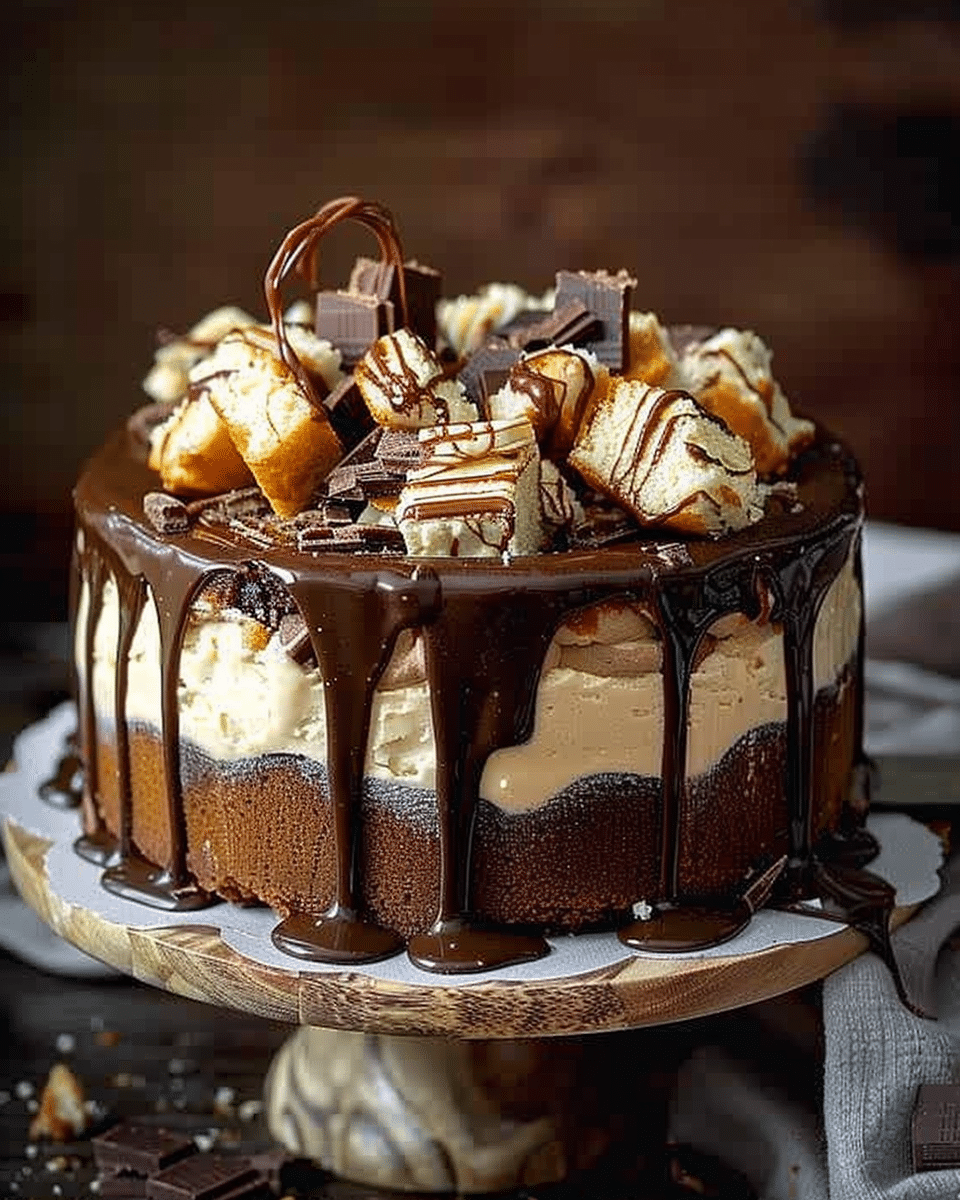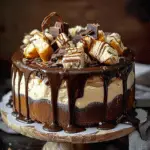 This Snickers Cheesecake Cake is an indulgent layered dessert combining rich chocolate cake, creamy vanilla cheesecake, and chopped Snickers bars, topped with silky chocolate ganache. It’s the perfect celebration cake for lovers of chocolate, caramel, and peanuts.