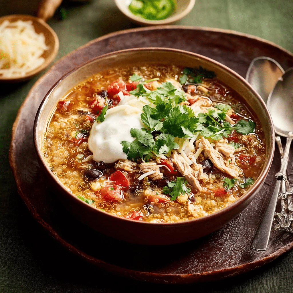 Rinse quinoa thoroughly to remove bitterness.For extra spice, add diced jalapeños or a pinch of cayenne pepper.Soup thickens as it sits — add extra broth when reheating if needed.Great for meal prep — flavors deepen the next day.