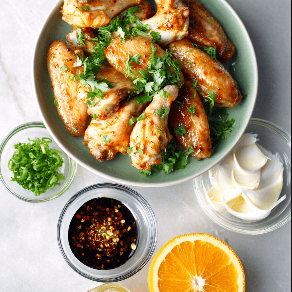 chicken wings salt black pepper garlic powder paprika baking powder (for crispiness, optional) orange juice lime juice lemon juice orange zest honey soy sauce hot sauce fresh garlic ginger red pepper flakes cornstarch water