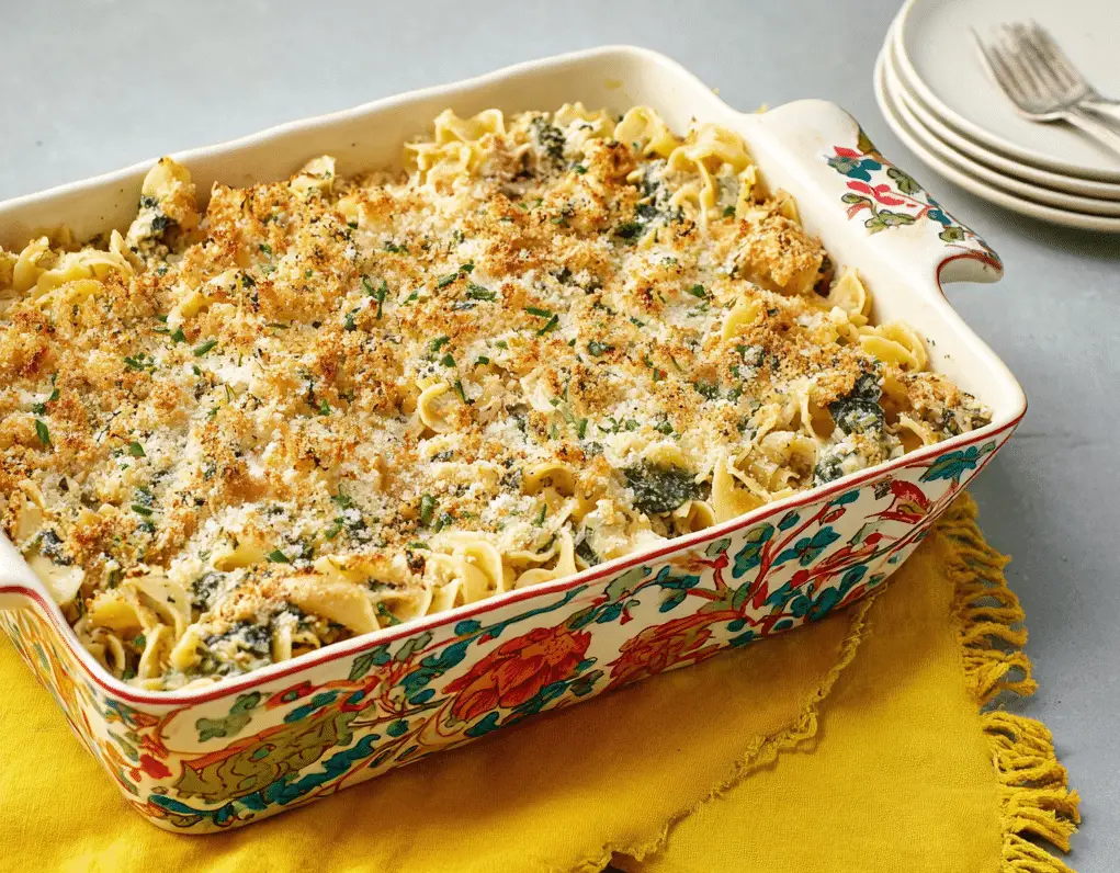 This Spinach & Tuna Noodle Casserole is a creamy, comforting baked pasta dish made with tender egg noodles, flaky tuna, fresh spinach, and a rich homemade sauce. Topped with melted cheese and crispy breadcrumbs, this easy tuna noodle casserole recipe is perfect for busy weeknights, meal prep, or a cozy family dinner.