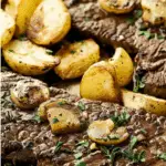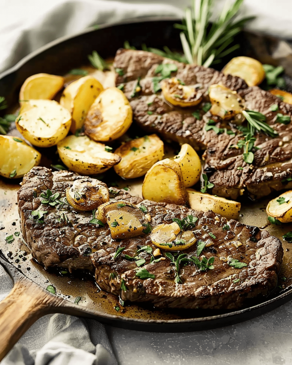 Store leftovers in an airtight container in the refrigerator for up to 3 days. To reheat, warm the steak gently in a skillet or in the oven at 300°F. Avoid microwaving to prevent the steak from becoming tough. Potatoes can be reheated in a skillet or oven for best texture, or in the microwave if needed.