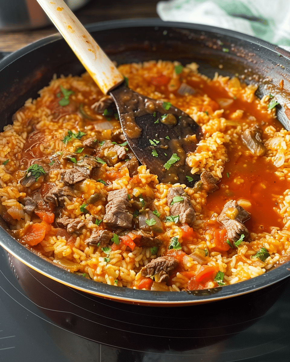 Return steak to skillet and toss gently to coat or serve steak on top of rice.