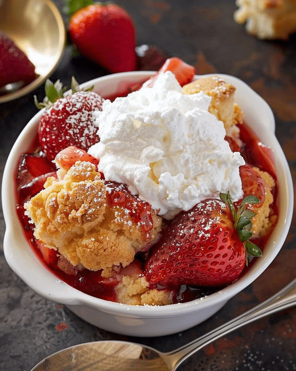 A warm, fruity dessert made with juicy strawberries and a golden, buttery topping. Sweet, slightly tart, and bursting with fresh flavor, it’s perfect with a scoop of vanilla ice cream or whipped cream.