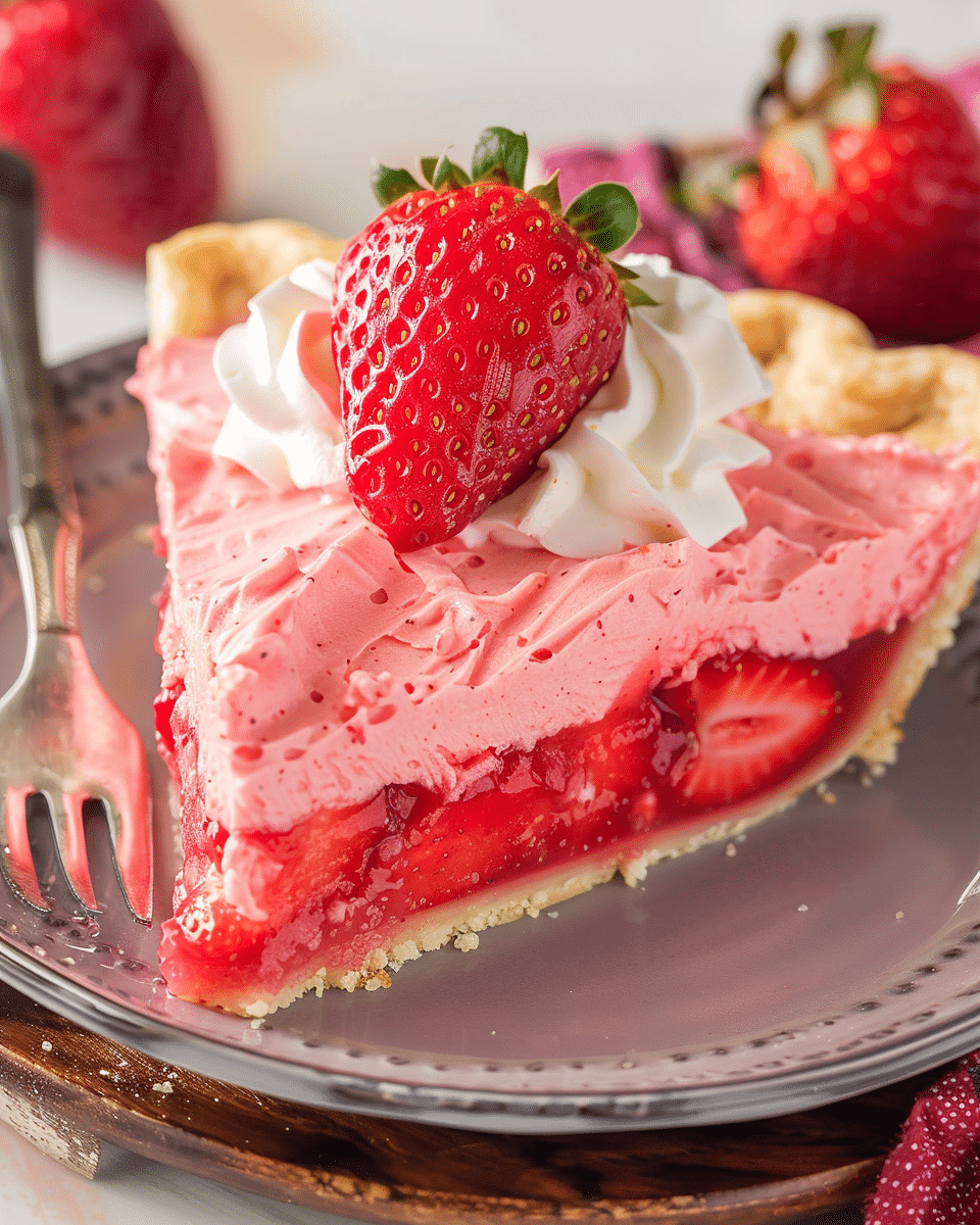 Before serving, garnish the pie with sliced fresh strawberries and a dollop of whipped cream, if desired.