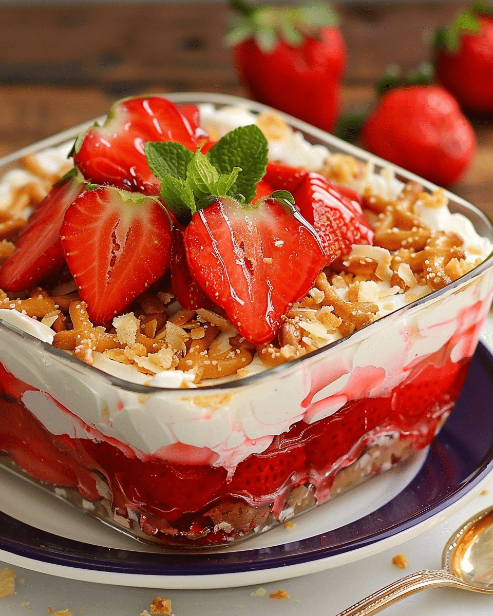 Ensure cream cheese layer is sealed to the edges to prevent soggy crust.Let the gelatin cool before pouring to avoid mixing layers.Use fresh strawberries for best texture, or thawed frozen berries if needed.Substitute whipped topping with stabilized whipped cream if preferred.Use gluten-free pretzels for a gluten-free version.