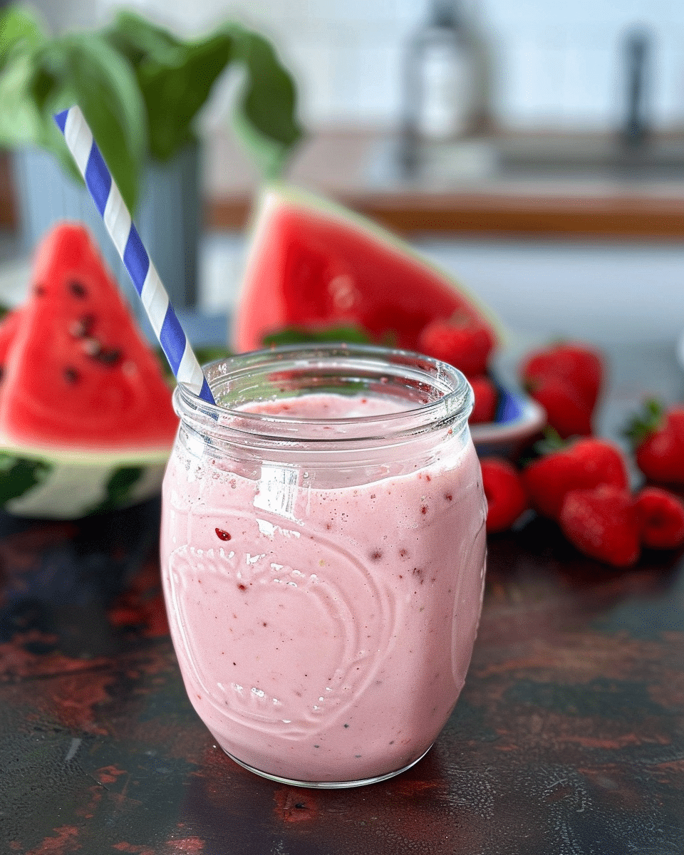 A refreshing and hydrating smoothie made with sweet watermelon, tangy strawberries, and creamy yogurt. Perfect for breakfast, a healthy snack, or a post-workout drink.