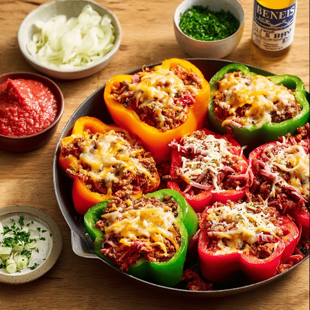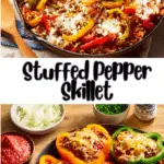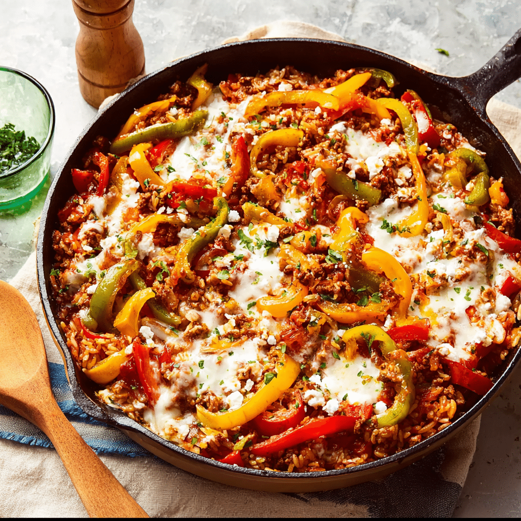 This stuffed pepper skillet is an easy one-pan dinner packed with ground beef, rice, bell peppers, and a rich tomato sauce, all topped with melted cheese. It delivers the classic flavors of stuffed peppers in a quicker, more convenient skillet meal—perfect for busy weeknights and meal prep.