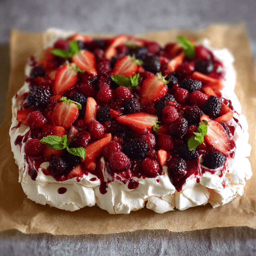 You can switch up the toppings with tropical fruits like mango and kiwi or add a drizzle of passion fruit sauce for a tangy twist. For a chocolate version, fold cocoa powder into the meringue or drizzle melted chocolate over the finished dessert. You can also make mini pavlovas for individual servings.
