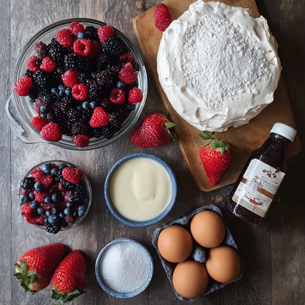 egg whites granulated sugar cornstarch white vinegar or lemon juice vanilla extract heavy cream powdered sugar mixed fresh berries (strawberries, blueberries, raspberries)