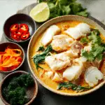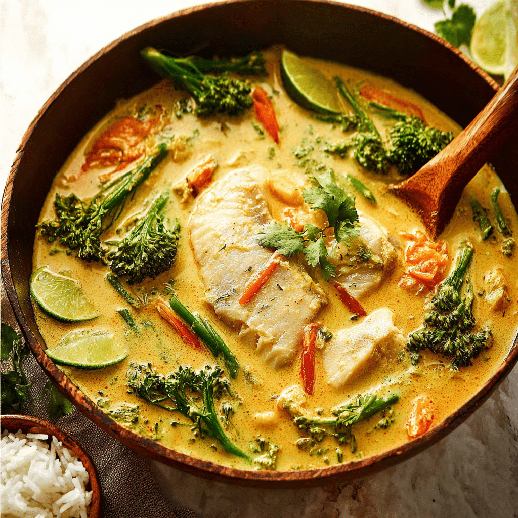 A fragrant and comforting Thai-inspired curry featuring tender white fish simmered in a creamy coconut sauce with aromatic herbs, lime, and bold curry flavors.
