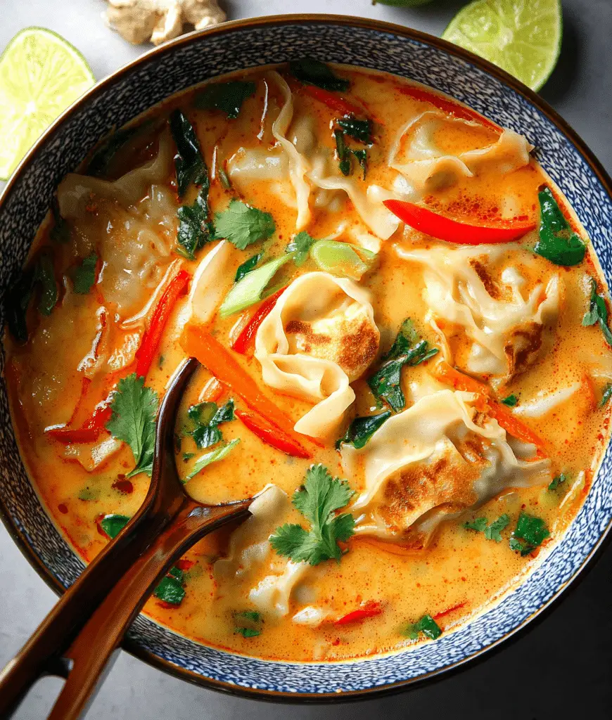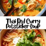 A comforting and flavorful Thai-inspired soup made with red curry, creamy coconut milk, tender potstickers, and fresh vegetables, ready in about 30 minutes.