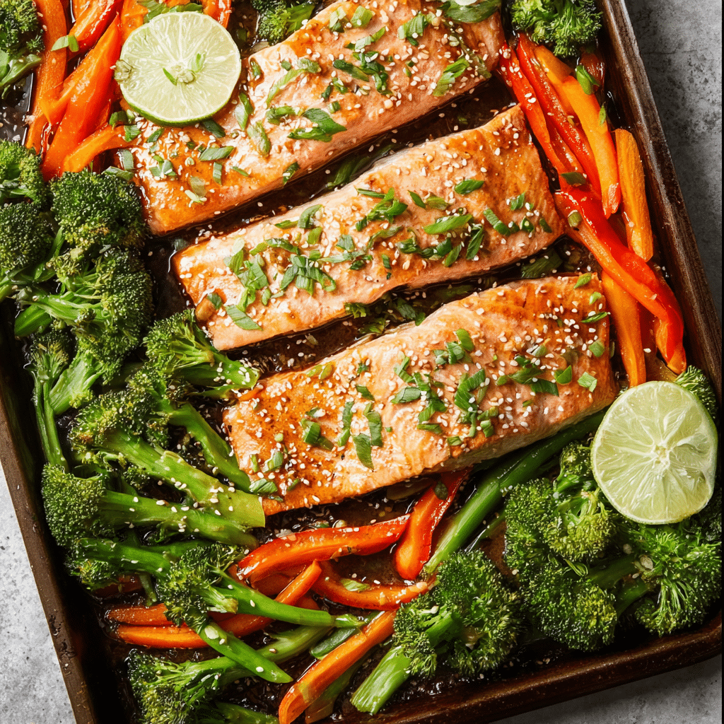 This Asian salmon sheet pan dinner is a quick and healthy one-pan meal featuring tender, flaky salmon glazed in a savory-sweet soy, garlic, and ginger sauce. Paired with roasted vegetables, this easy sheet pan salmon recipe is perfect for busy weeknights and delivers bold Asian-inspired flavors with minimal cleanup.