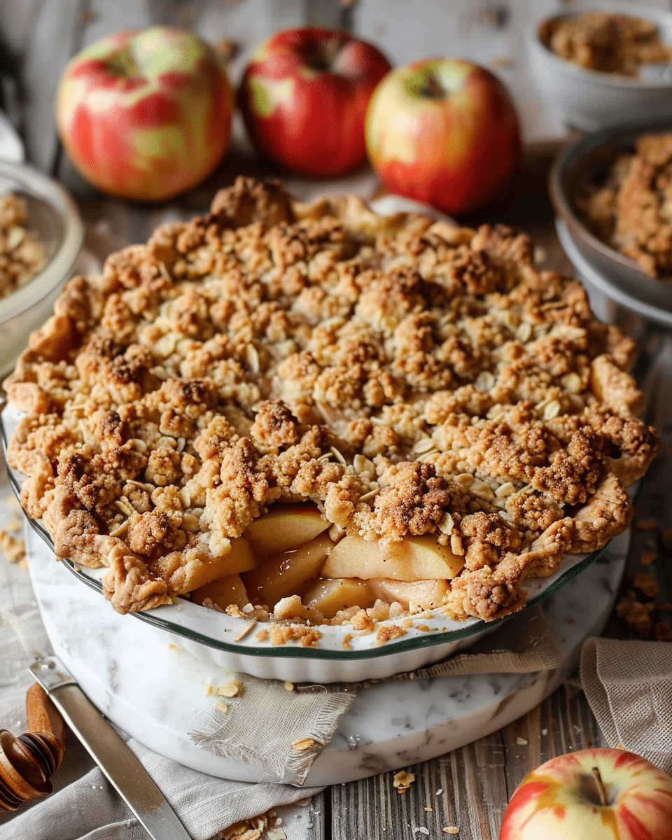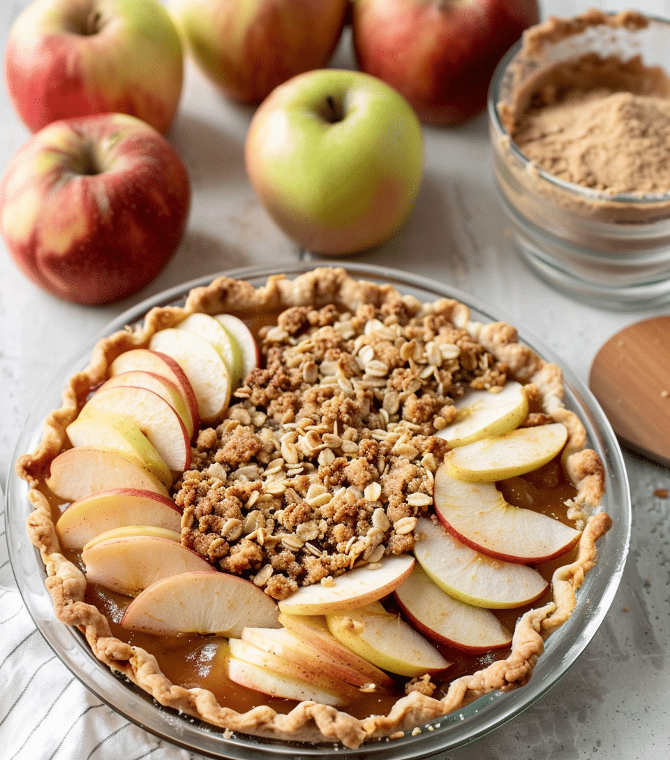Add chopped pecans or walnuts to the topping for extra crunch.Use a mix of tart and sweet apples for best flavor.Add a pinch of ginger or cardamom for extra spice.For a gluten-free version, use GF crust and GF flour in the topping.Serve warm with vanilla ice cream or whipped cream.
