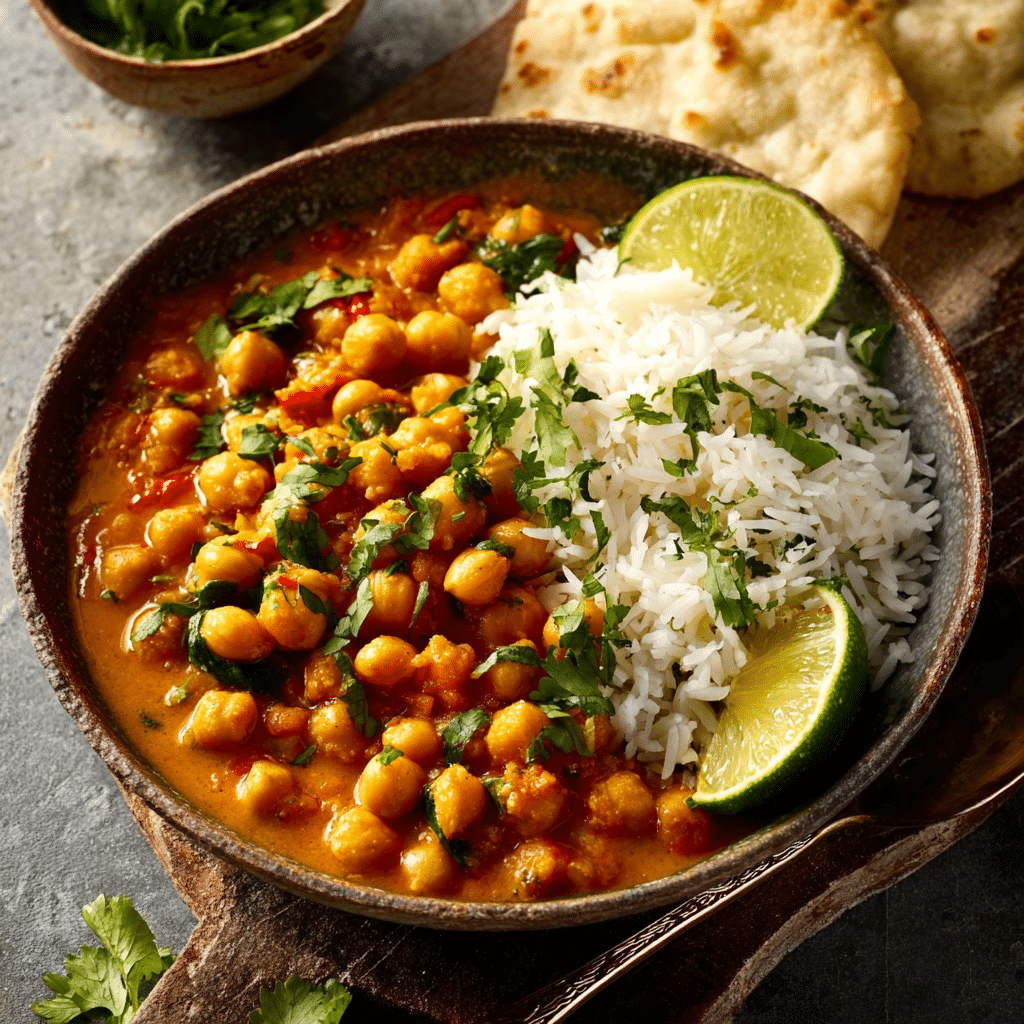 This chickpea curry recipe is a rich, creamy, and flavorful dish made with tender chickpeas simmered in a spiced tomato and coconut sauce. Packed with plant-based protein and warming spices, this easy vegan curry is perfect for a quick and satisfying meal.
