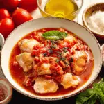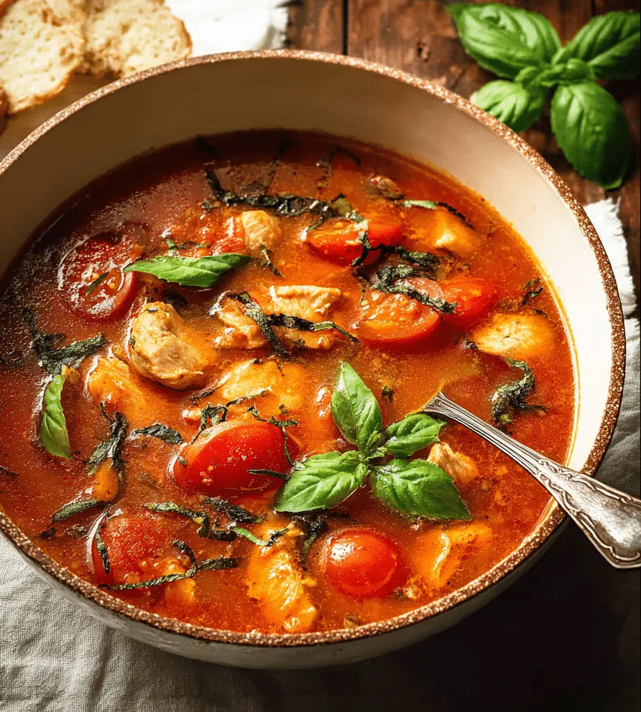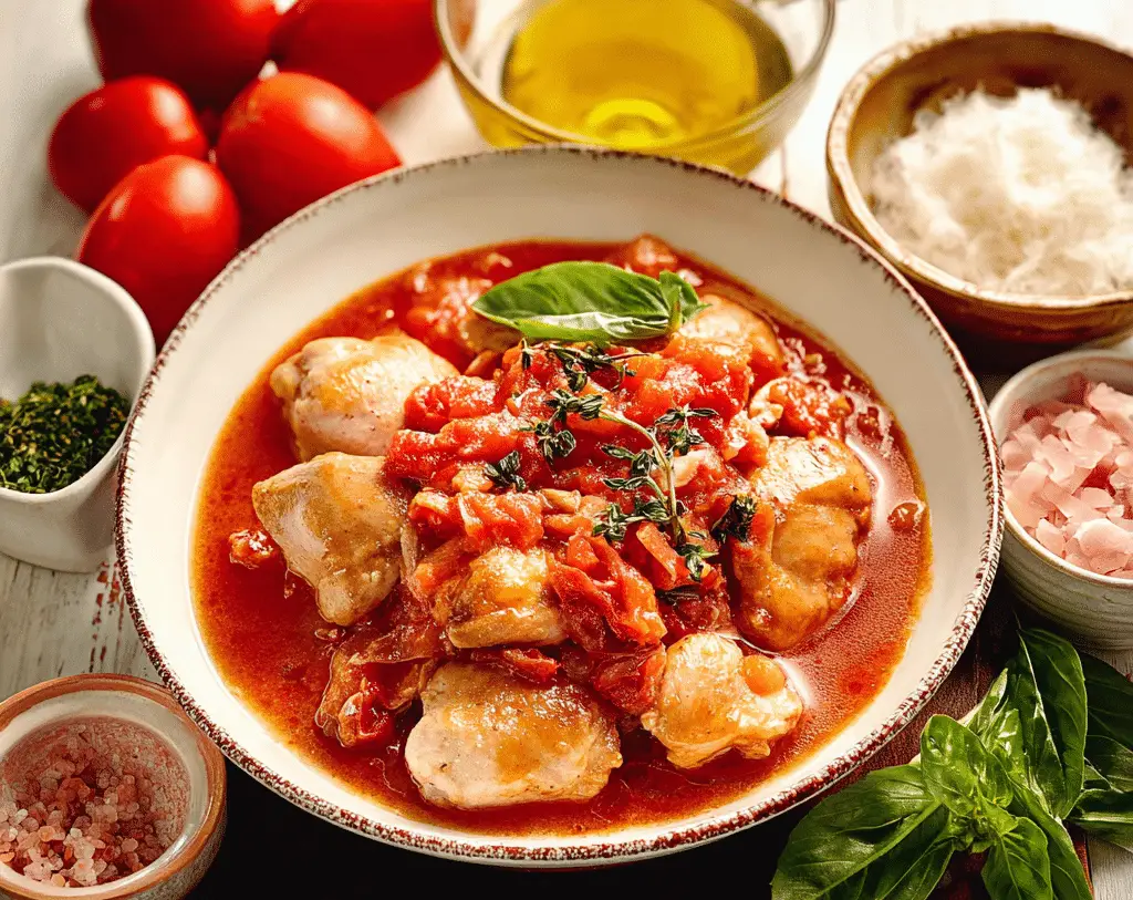 A comforting one-pot stew made with tender chicken simmered in a rich tomato broth with fresh basil, vegetables, and simple Italian-inspired flavors.