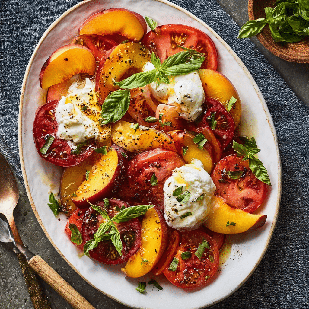 This salad brings together contrasting flavors and textures in the best way. The sweetness of peaches pairs beautifully with the acidity of tomatoes, while burrata adds a rich, creamy element that ties everything together. It’s quick to assemble, requires no cooking, and looks stunning on the plate. Perfect for entertaining or enjoying a refreshing meal without much effort.
