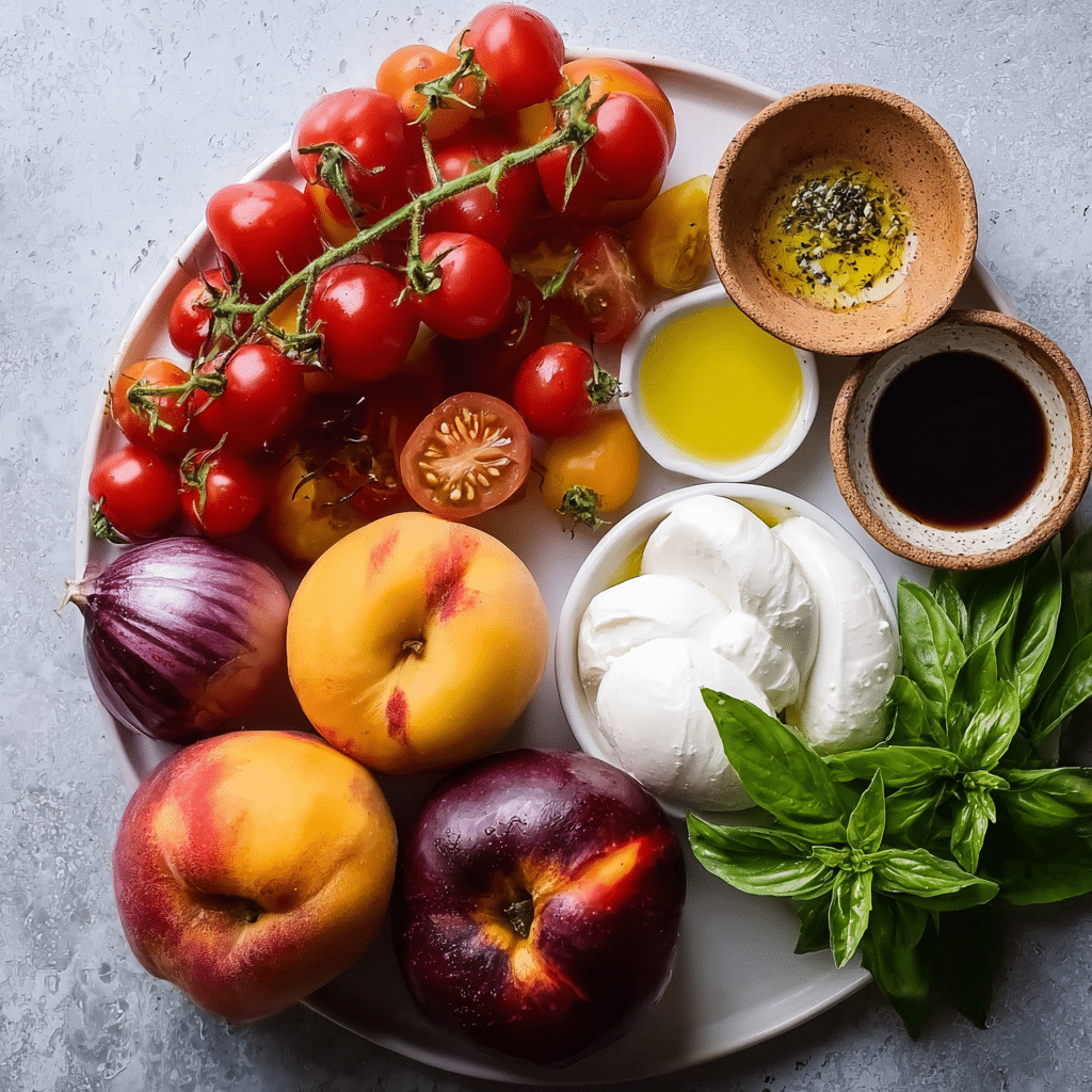 Start by washing and slicing the peaches and tomatoes into evenly sized pieces. Arrange them on a serving platter, alternating for a visually appealing presentation.