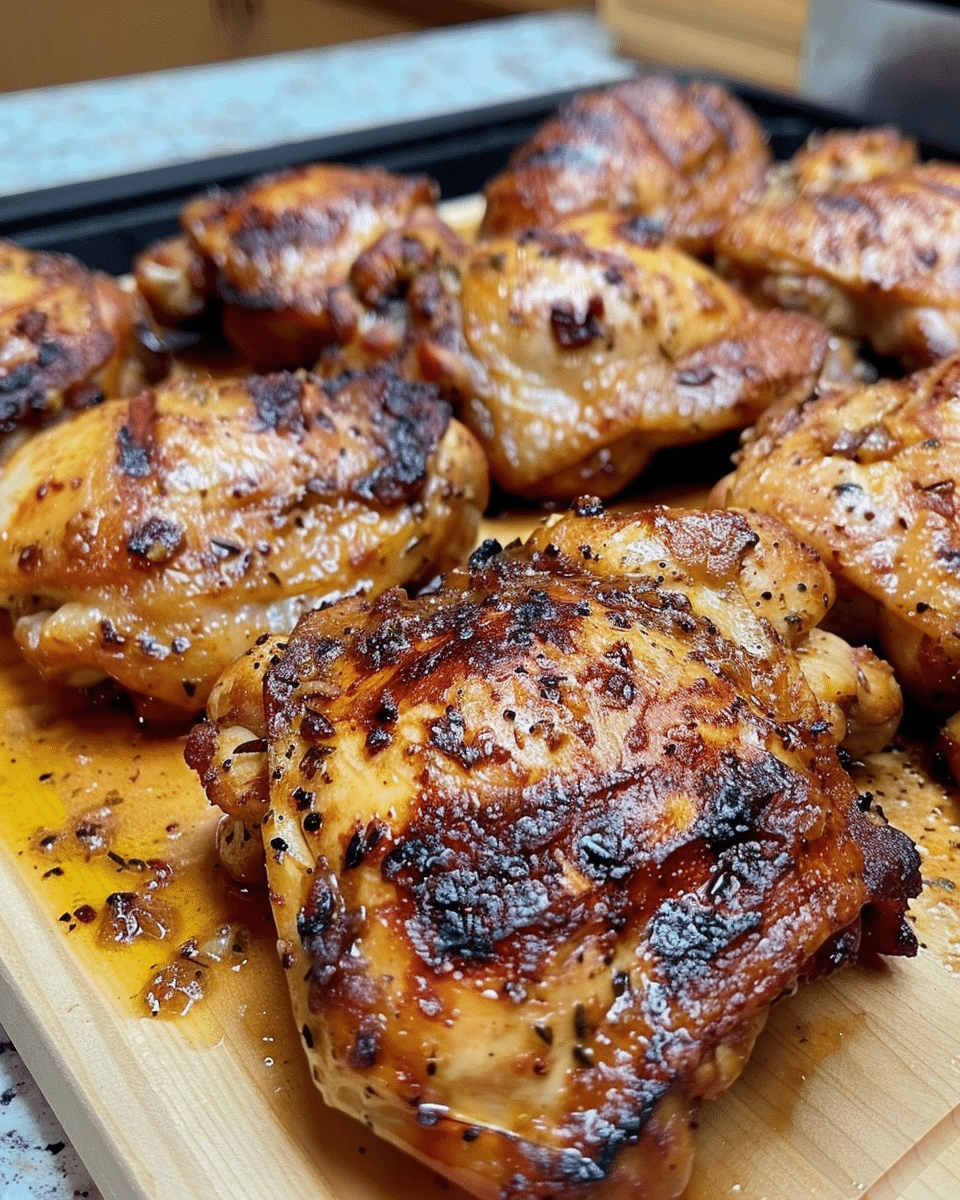 Store leftover chicken thighs in an airtight container in the refrigerator for up to 4 days. To reheat, warm them in the oven at 350°F for 10–15 minutes or in a skillet over medium heat until hot. Avoid microwaving to preserve the crisp skin. You can also freeze them for up to 2 months and thaw overnight in the fridge before reheating.