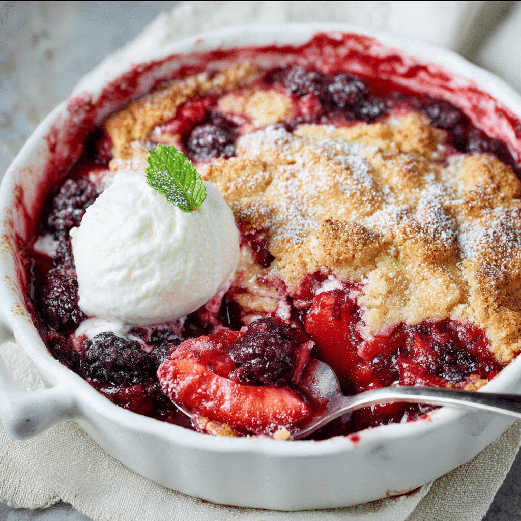 This Triple Berry Cobbler is a warm, comforting dessert featuring juicy strawberries, blueberries, and raspberries under a golden, buttery crust. Easy to make and perfect for any season, this classic cobbler is ideal served on its own or with a scoop of ice cream for a crowd-pleasing treat.