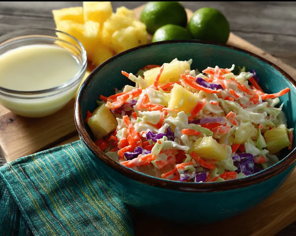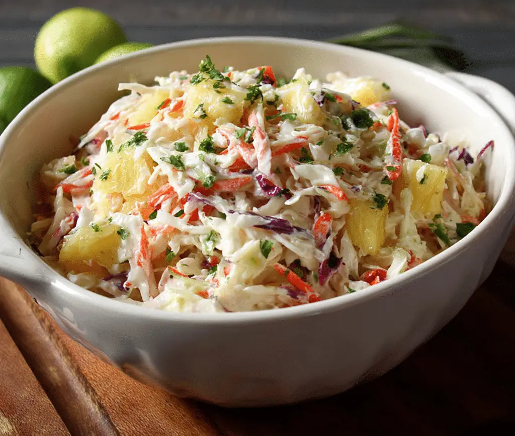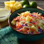 Tropical Pineapple Coconut Coleslaw is a bright, refreshing salad made with crisp cabbage, sweet pineapple, and shredded coconut tossed in a creamy, lightly sweet lime dressing. It’s the perfect tropical-inspired side dish for grilled meats, seafood, or summer gatherings.