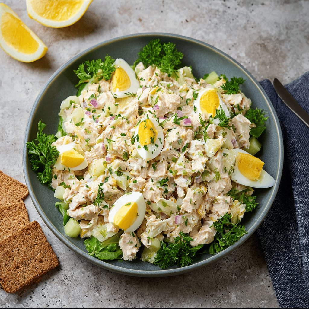 This Tuna Salad with Egg is a creamy, protein-rich and easy-to-make dish perfect for quick lunches, sandwiches, or light dinners. Made with simple pantry ingredients like tuna, boiled eggs, and a flavorful dressing, this recipe is both nutritious and satisfying.