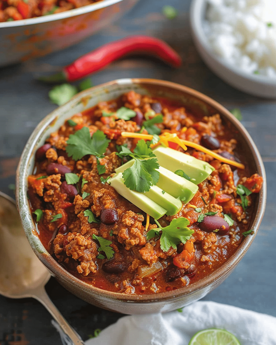 Simmer uncovered for a thicker chili.Swap ground turkey for ground chicken if desired.Make it spicier with jalapeños, chipotle, or more red pepper flakes.Freeze portions for easy meal prep—lasts up to 3 months frozen.Great with toppings like cheese, sour cream, avocado, or tortilla chips.