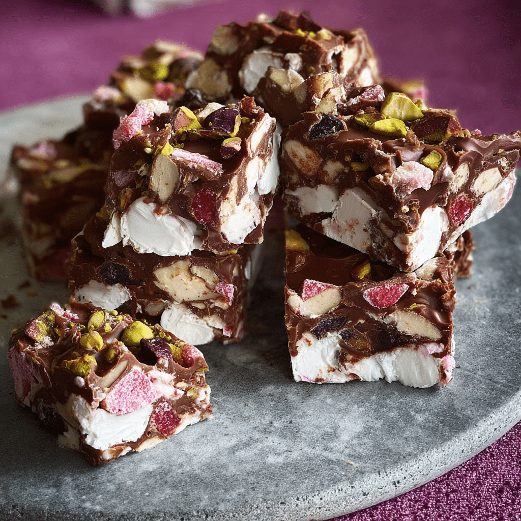 This recipe is quick, easy, and requires no oven, making it perfect for busy days or beginner bakers. The combination of smooth melted chocolate with crunchy and chewy mix-ins creates a satisfying bite every time. The Turkish delight adds a unique twist with its subtle rose flavor, elevating a classic rocky road into something more special. It’s also highly customizable and great for sharing.