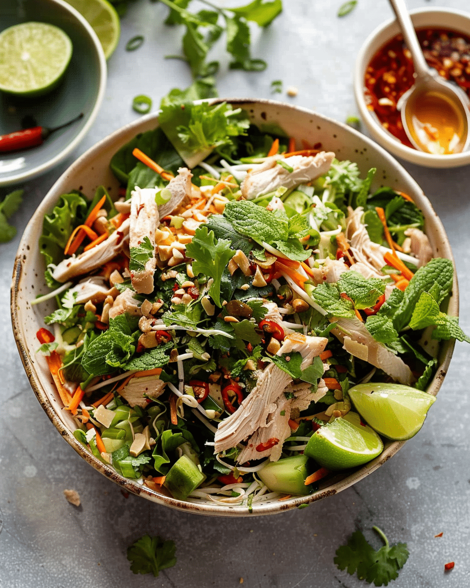 Use rotisserie chicken for a quick shortcut.Add cooked rice noodles to make it a more filling main dish.Prepare dressing and veggies ahead, but toss just before serving for best texture.For a vegan version, use tofu and vegan fish sauce or soy sauce.