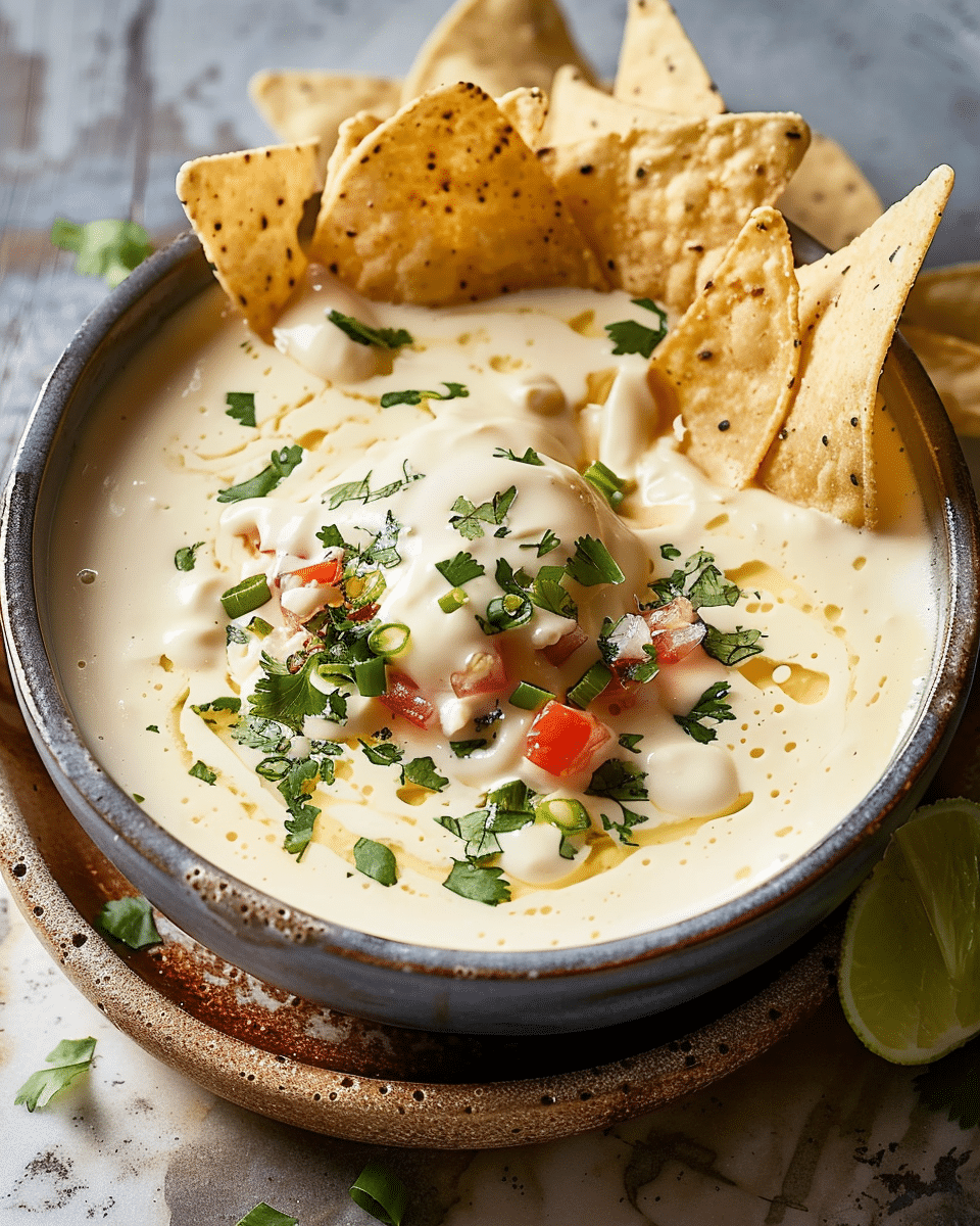 This White Queso Dip is ultra-creamy and loaded with flavor, making it a perfect choice for anyone who loves a smooth, cheesy dip with a hint of spice. The addition of green chilies and spices gives it just the right amount of kick without being overwhelming, and the blend of cheeses creates a rich, melt-in-your-mouth experience. It’s incredibly easy to make, and the best part is that it only takes a few ingredients to achieve a flavor-packed dip that’s perfect for any occasion. Whether you’re dipping chips, nachos, or even vegetables, this dip will quickly become your go-to cheesy indulgence.