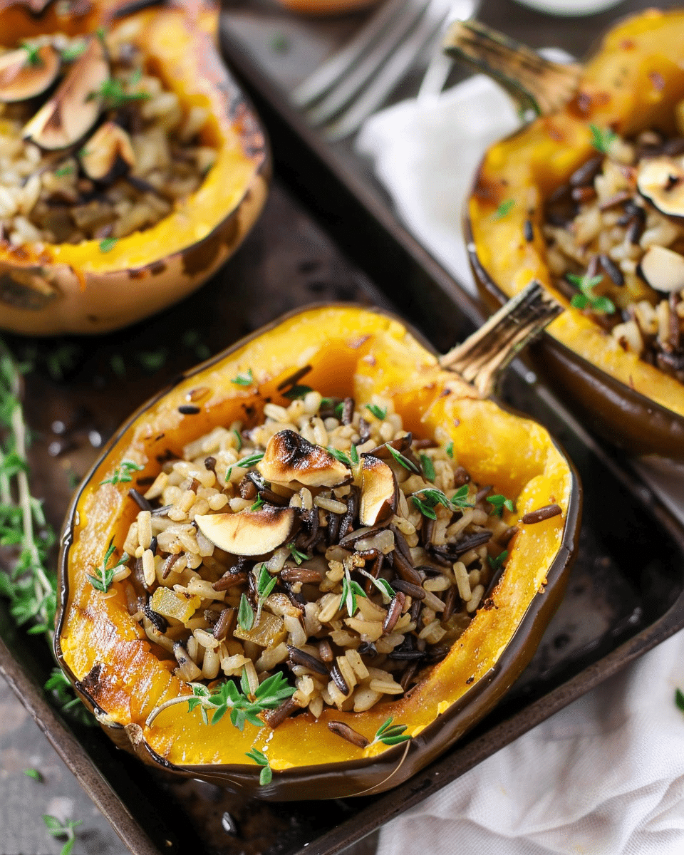 Turn roasted squash halves cut-side up and fill with the wild rice mixture.